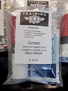 - First Aid Training Pack included for each student containing CPR Face-shield, training bandage, triangular bandage, and gloves.